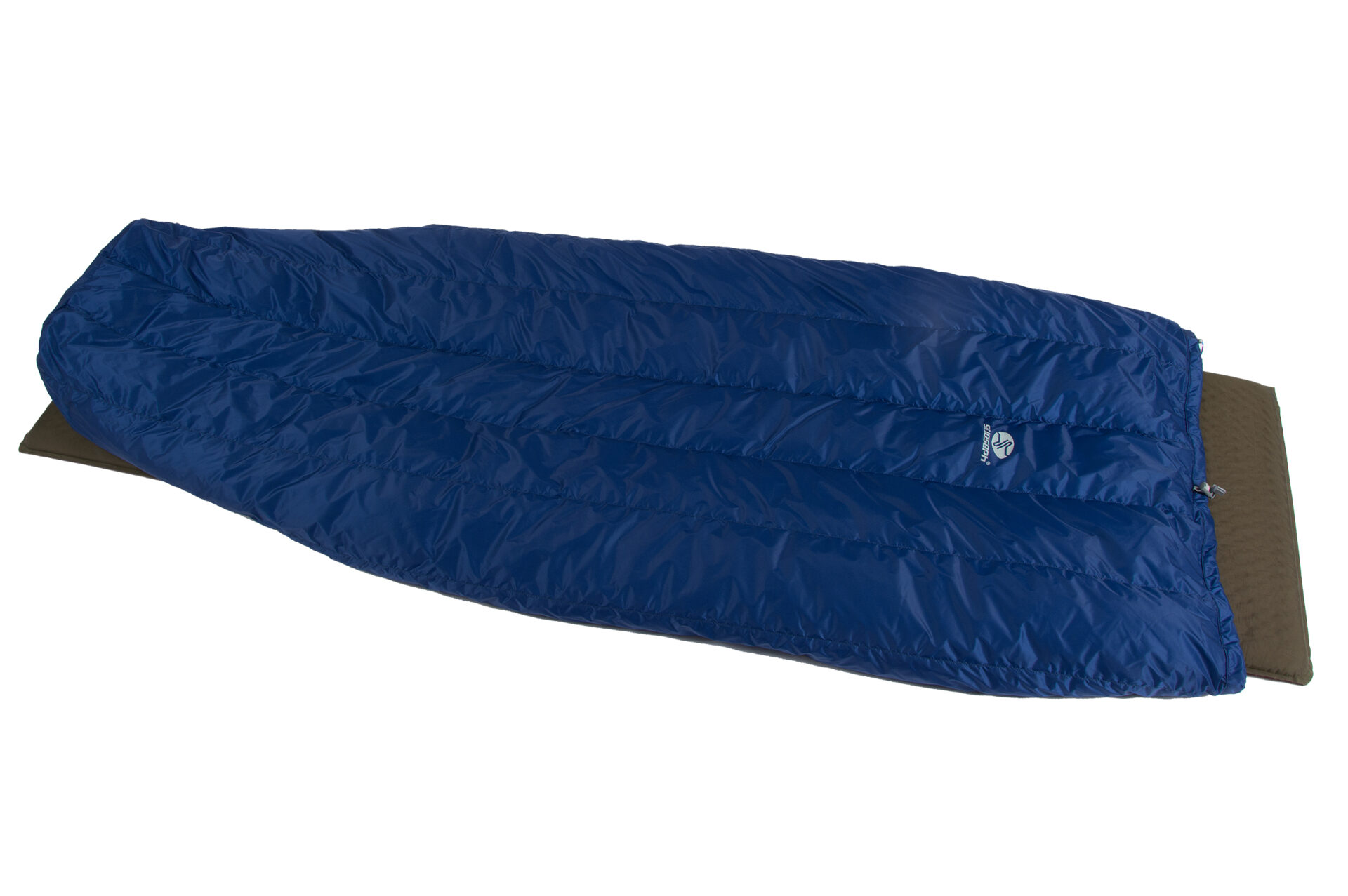 Ultralehký 2-3 sezónní spacák typu „přikrývka“ bez zipu a s redukovaným spodním dílem pro úsporu váhy i objemu a pro pohodlné spaní jen tak na karimatce či v hamace.