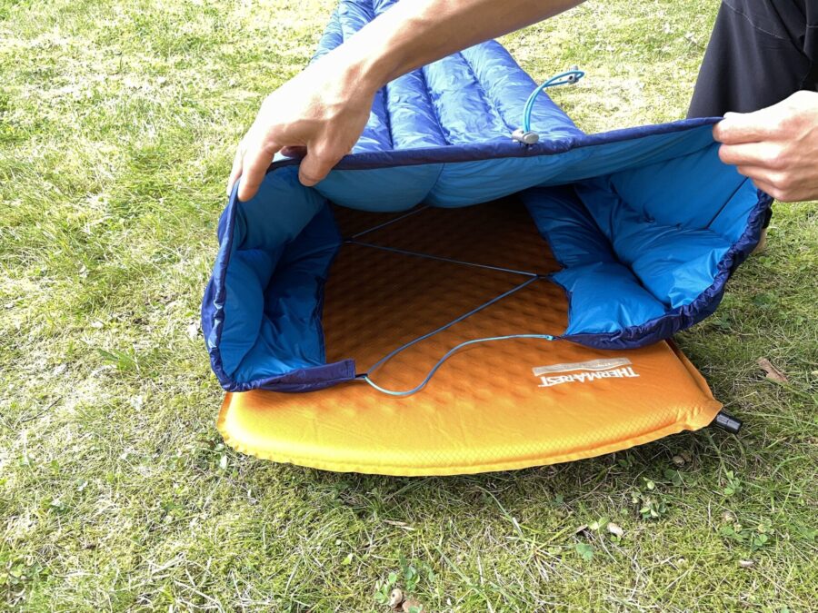 Quilt lze použít přichycený ke karimatce, volně v hamace, anebo (po rychlém vyndání šňůrek) jako lehkou otevřenou přikrývku, kterou oceníte třeba při čekání na letišti, v autě apod…